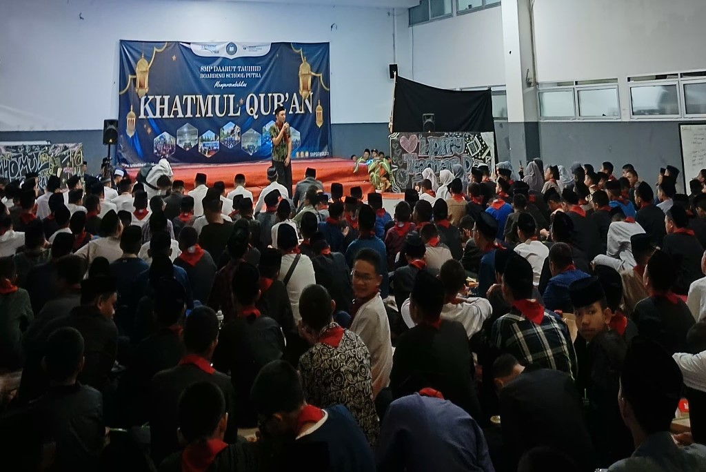 BANDUNG – Ada yang berbeda dari peringatan Hari Guru Nasional di SMP Daarut Tauhiid Boarding School (DTBS) Putra. Pasalnya, perayaan Hari Guru Nasional pada (25/11/2024) tersebut dibarengi dengan kegiatan rutin Khotmul Quran yang diselenggarakan setiap bulannya. Kegiatan tersebut berlangsung di Aula Masjid Rahmatan Lil’alaamiin, Eco Pesantren 1 Daarut Tauhiid, Jl. Cigugur Girang, Kab. Bandung Barat.