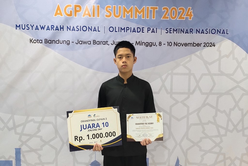 BANDUNG – Muhammad Faiz Assiba’i siswa kelas 9B SMP Daarut Tauhiid Boarding School (DTBS) Putra telah menorehkan prestasi yang membanggakan. Pasalnya, Faiz berhasil meraih Top Juara 10 Besar Nasional pada kegiatan Olimpiade Pendidikan Agama Islam Tingkat Nasional (OLPAIN)Tahun 2024. Pada (10/11/2024) di Universitas Muhammadiyah Bandung.