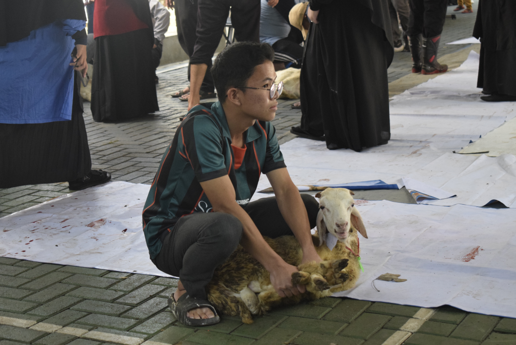 Seorang santri turut andil dalam proses penyembelihan hewan kurban di Eco Pesantren 1 Daarut Tauhiid pada (17/6/2024)