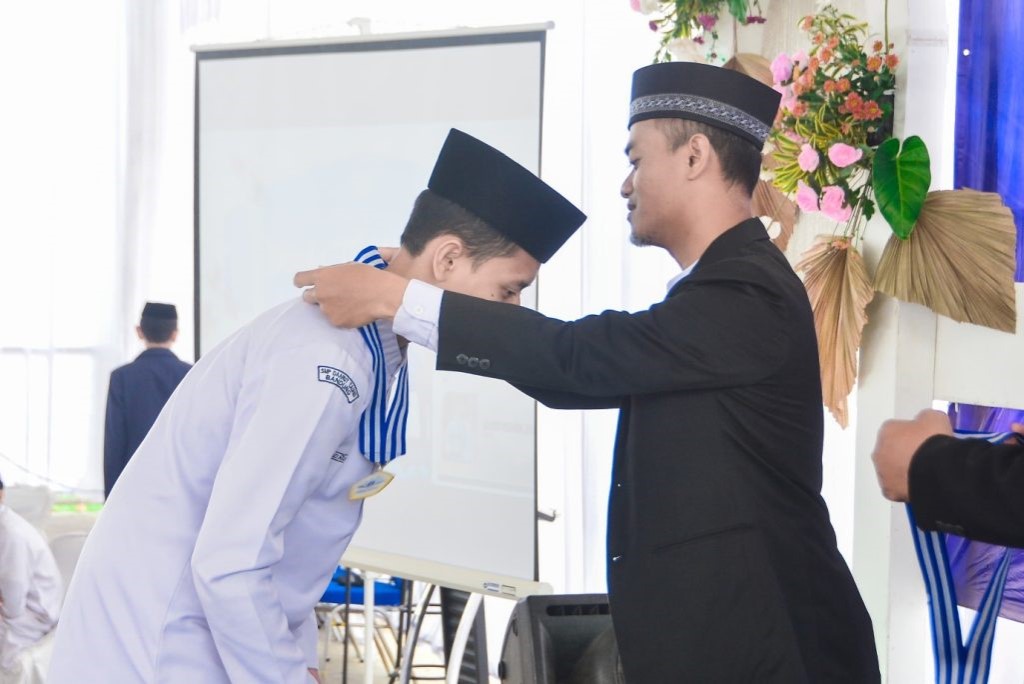 Penyematan medali tahfidz kepada santri oleh kepala sekolah SMP DTBS Putra, Hamdani, S. Pd. I pada (27/3/2024)