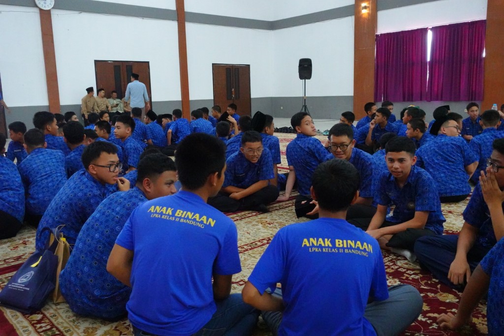 Potret santri SMP DTBS Putra bercengkrama dengan Anak Binaan saat mengunjungi Lembaga Pembinaan Khusus Anak Kelas II Bandung pada (28/5/2025) di  LPKA Kelas II Bandung Arcamanik, Bandung.
