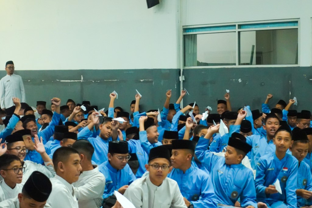 Potret santri SMP DTBS Putra antusias mengikuti kegiatan Training Motivasi pada (23/5/2025) di Aula Masjid Rahmatan Lil’aalamiin, Eco Pesantren 1 Daarut Tauhiid.